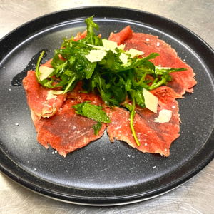 Ωμό πιπεράτο μοσχάρι κομμένο σε λεπτές φέτες με ρόκα, χοντρό αλάτι, λεμόνι & flakes παρμεζάνας