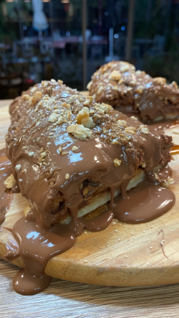 Calzone γεμιστό με πραλίνα φουντουκιού και τριμμένο μπισκότο & επικάλυψη με πραλίνα φουντουκιού, τριμμένο μπισκότο και σιρόπι καραμέλας