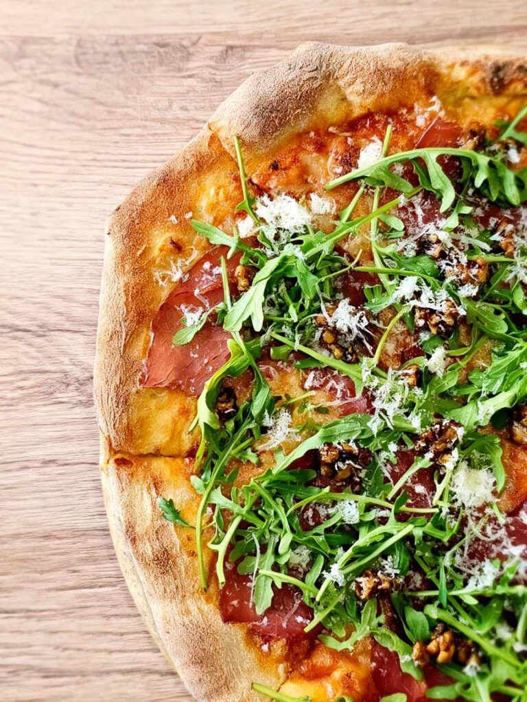 Σάλτσα ντομάτας, μοτσαρέλα, bresaola, καραμελωμένα καρύδια, ρόκα & παρμεζάνα