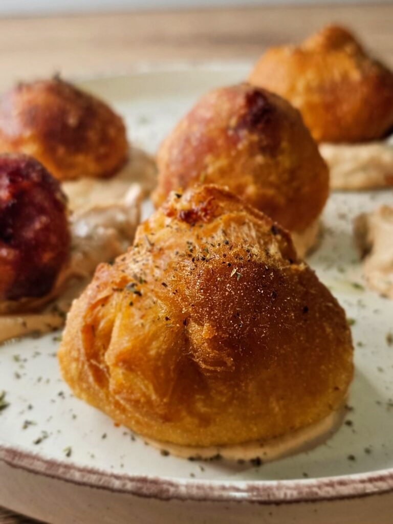 Τηγανητές μπουκίτσες από το ζυμάρι πίτσας, γεμιστές με σάλτσα ντομάτας, τυρί, βοδινό λουκάνικο και πιπεριές φλωρίνης. Συνοδεύονται από sauce κρέμα τυριού
