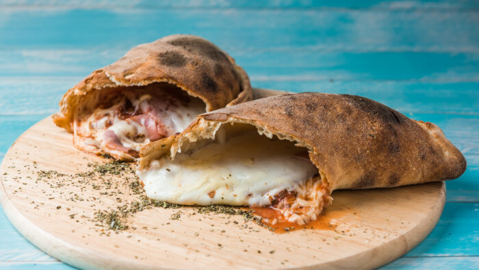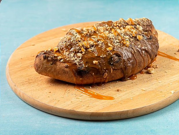 Calzone γεμιστό με πραλίνα φουντουκιού και τριμμένο μπισκότο & επικάλυψη με πραλίνα φουντουκιού, τριμμένο μπισκότο και σιρόπι καραμέλα
