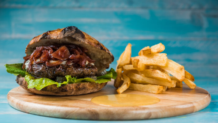 Μπιφτέκι black angus100% μοσχαρίσιο μεσα σε χειροποίητο ψωμάκι με μαρούλι, αγγουράκι τουρσί, καραμελωμένα κρεμμύδια, παρμεζάνα & honey and mustard sauce. Συνοδεύεται με φρέσκιες τηγανητές πατάτες.