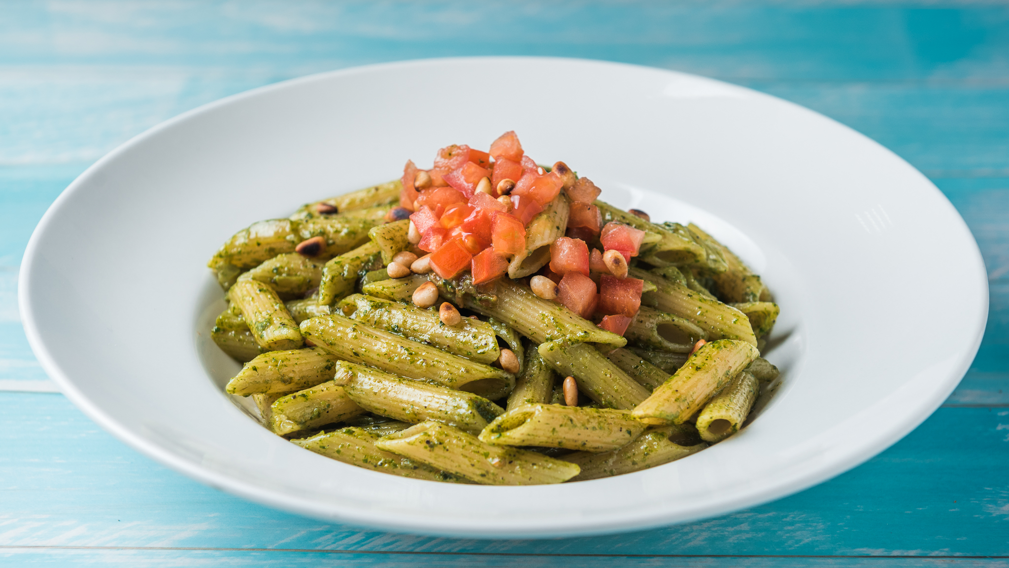 Πένες με χειροποίητο pesto βασιλικό, ντοματίνια, κρεμμύδι & κολοκυθάκι σοτέ