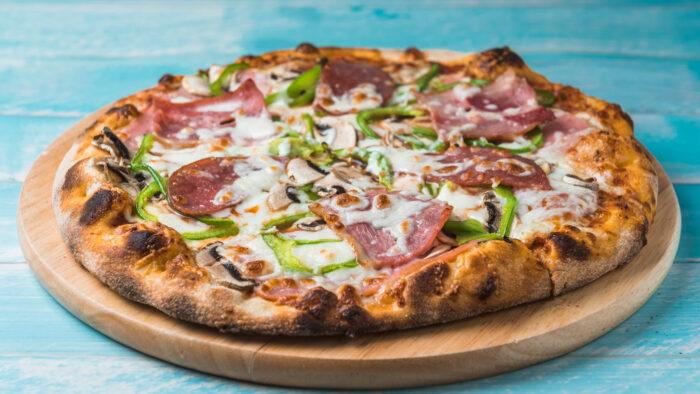 Σάλτσα ντομάτας, μοτσαρέλα, ζαμπόν, πεπερόνι, μπέικον, σαλάμι μπύρας, μανιτάρια & πράσινη πιπεριά