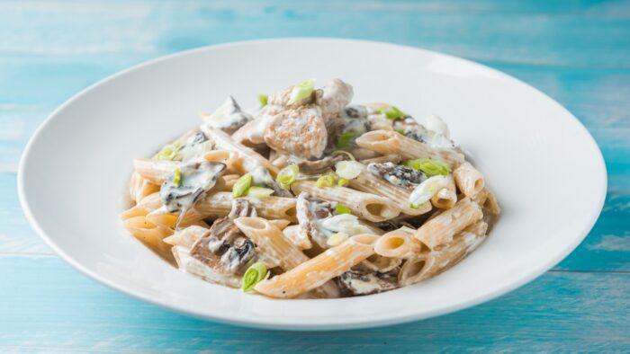 Πένες με κρέμα γάλακτος, κοτόπουλο, φρέσκα μανιτάρια champignon & σχοινόπρασο