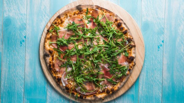Σάλτσα ντομάτας, μοτσαρέλα, προσούτο & ρόκα