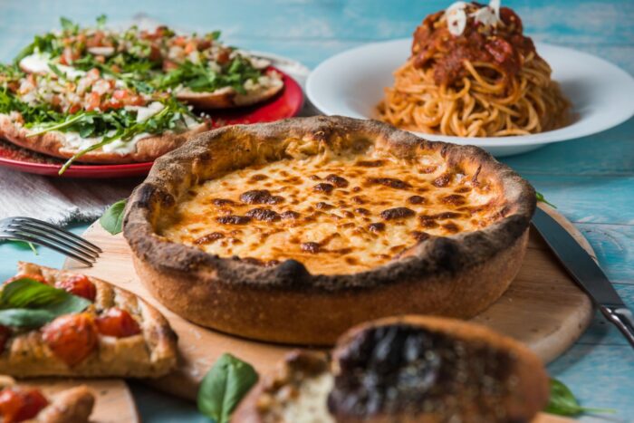 Λεπτή ζύμη με σάλτσα ντομάτας, φρέσκια μοτσαρέλα, ντοματίνια, παρμεζάνα, pecorino piccante & gorgonzola