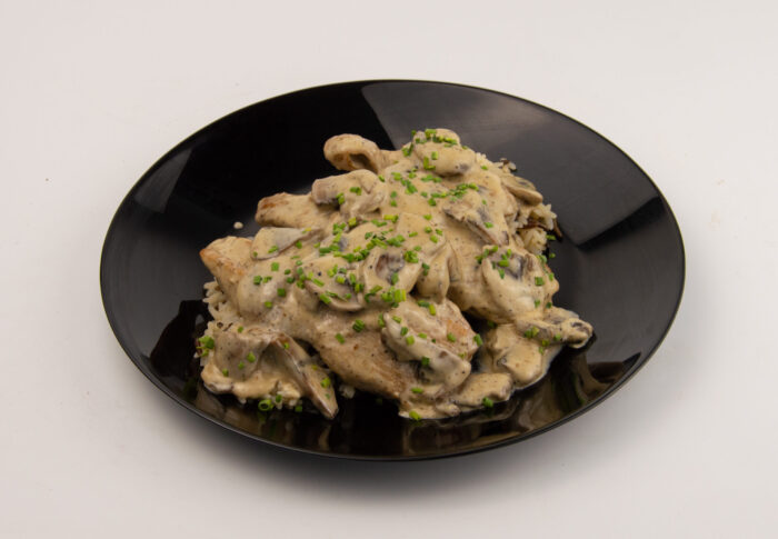 Φιλετίνια κοτόπουλο με κρέμα γάλακτος, φρέσκα μανιτάρια champignon & σχοινόπρασο. Συνοδεύονται από άγριο ρύζι