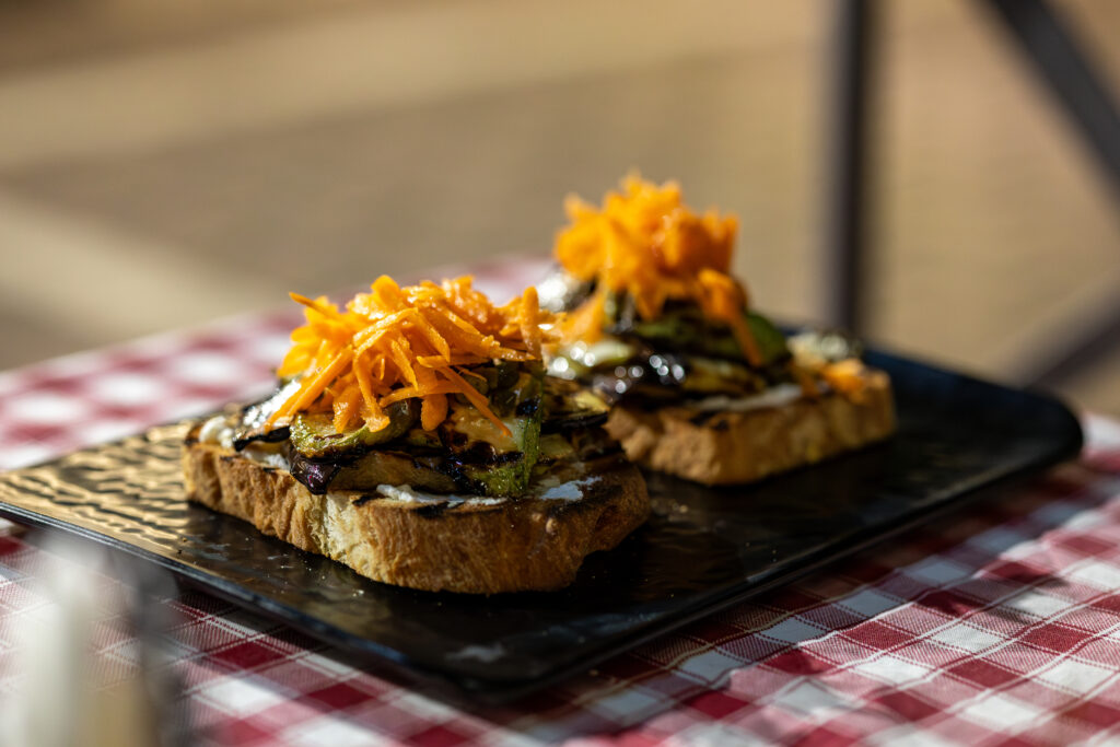 Φρυγανισμένα ψωμάκια με τυρί ricotta, ψητά λαχανικά, ψιλοκομμένη κάπαρη, τριμμένο καρότο, αρωματισμένο με λεμόνι