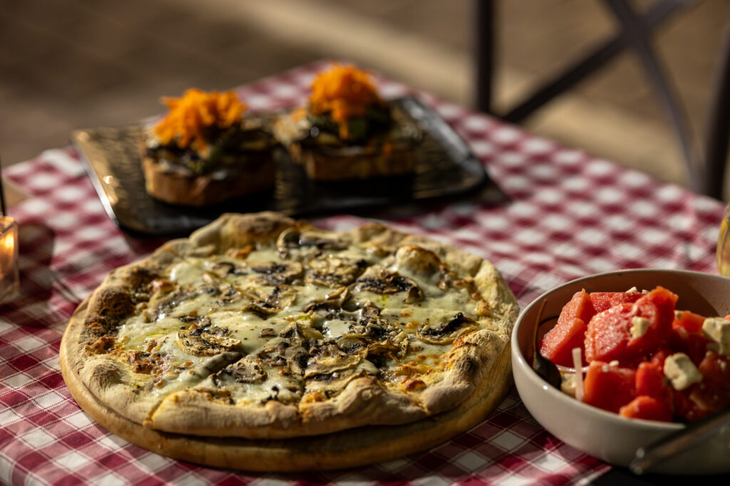 Λεπτή ζύμη με χειροποίητη πάστα μανιταριών, φρέσκια μοτσαρέλα, μανιτάρια, παρμεζάνα & pecorino piccante