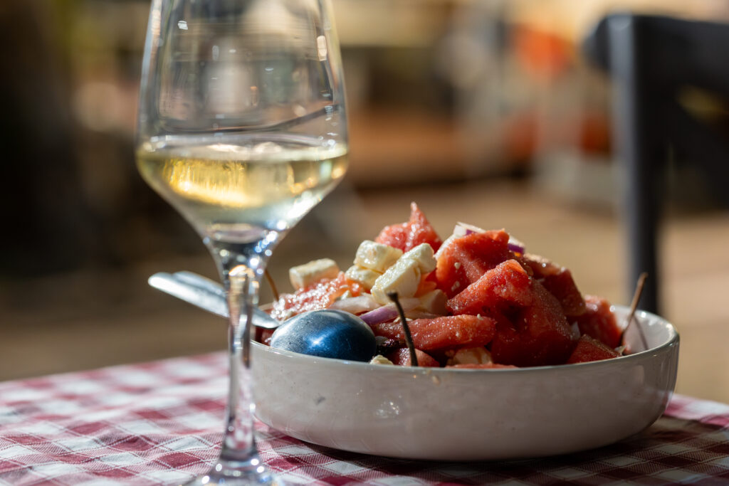 Με καρπούζι, λιαστή ντομάτα, κρεμμύδι, φέτα, καπαρόμηλα, ελαιόλαδο & λεμόνι